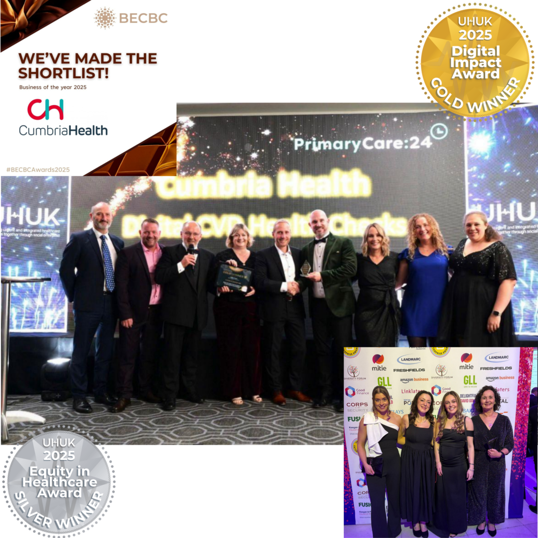 At the UHUK Awards, our impact was formally celebrated with a Silver Award for Health Inequalities for Hope Haven and a Gold Award for Technological Innovation for our CVD Health Checks programme, recognising our use of technology to improve access, outcomes, and equity in healthcare.